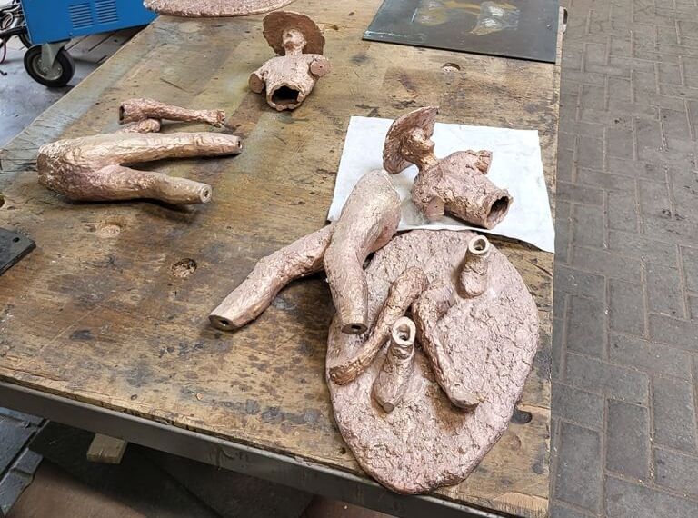 In einem weiteren Schritt haben wir die einzelnen Bronzeteile behutsam zusammengeschweißt, sodass die ursprüngliche Form der Skulptur wieder erkennbar war.