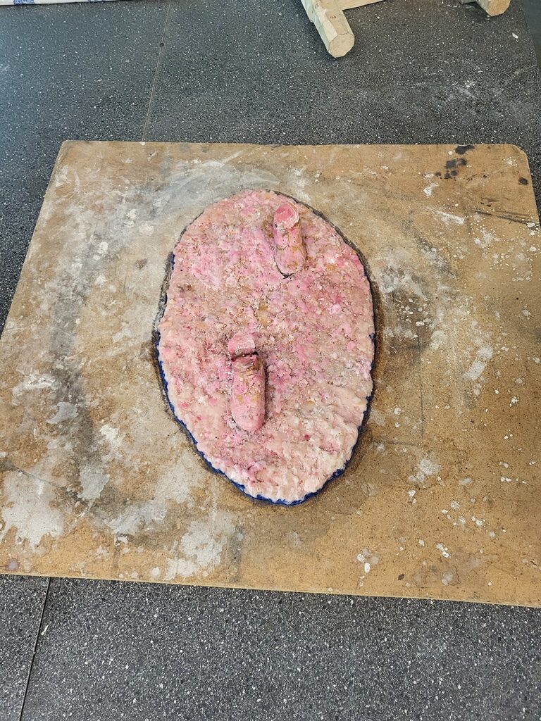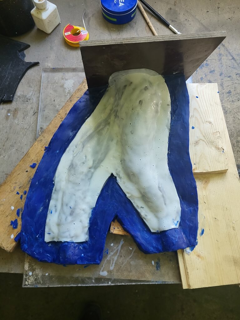 Im nächsten Schritt wurde die Silikonnegativform mit Wachs ausgegossen. Das nebenstehende Foto zeigt diese Silikonnegativform. In dem sogenannten Wachsausschmelzverfahren wird die Silikonform geschlossen und flüssiges Wachs hineingegossen.