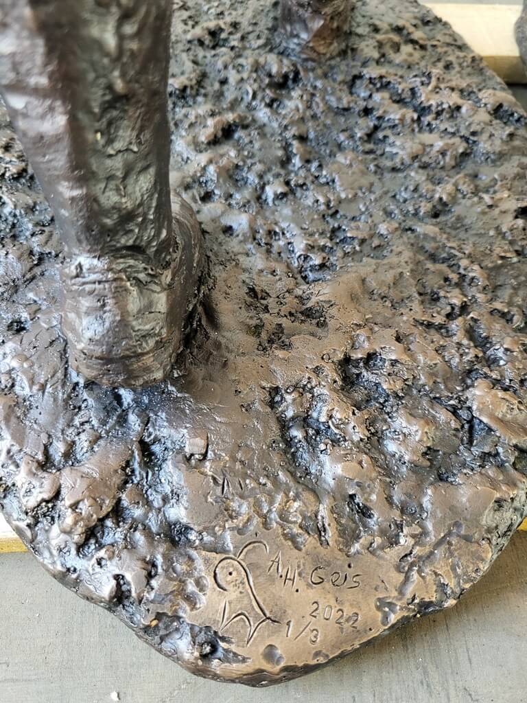 Die Skulptur hatte ihren Weg über mehrere Stationen in unsere Bronzegießerei in Eschenburg gefunden. Ursprünglich wurde die Figur vom Künstler als Wachsmodell gefertigt. Während sie auf einem Fensterbrett stand, führte die Sonneneinstrahlung dazu, dass sich das linke Bein im Laufe der Zeit leicht verformte. Diese Veränderung wurde Teil der Figur. Schließlich gelangte die Figur in unsere Werkstatt mit dem Auftrag, sie als Bronzeguss umzusetzen. Ziel war es, die Skulptur als Bronzeguss dauerhaft zu bewahren.
