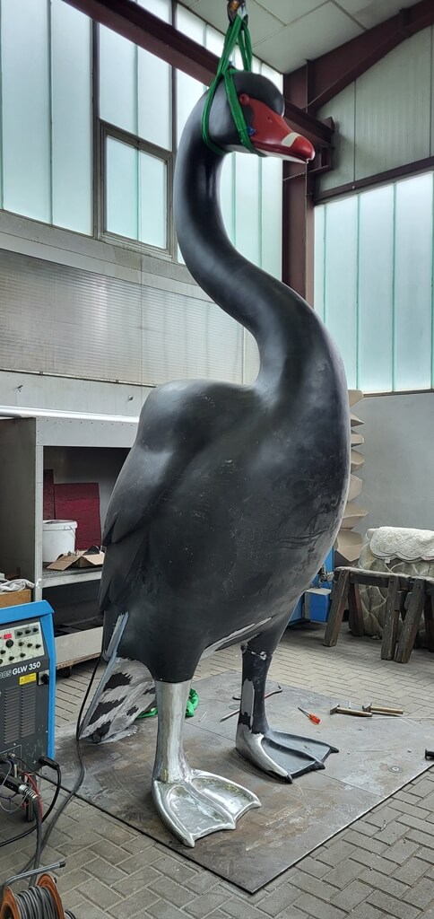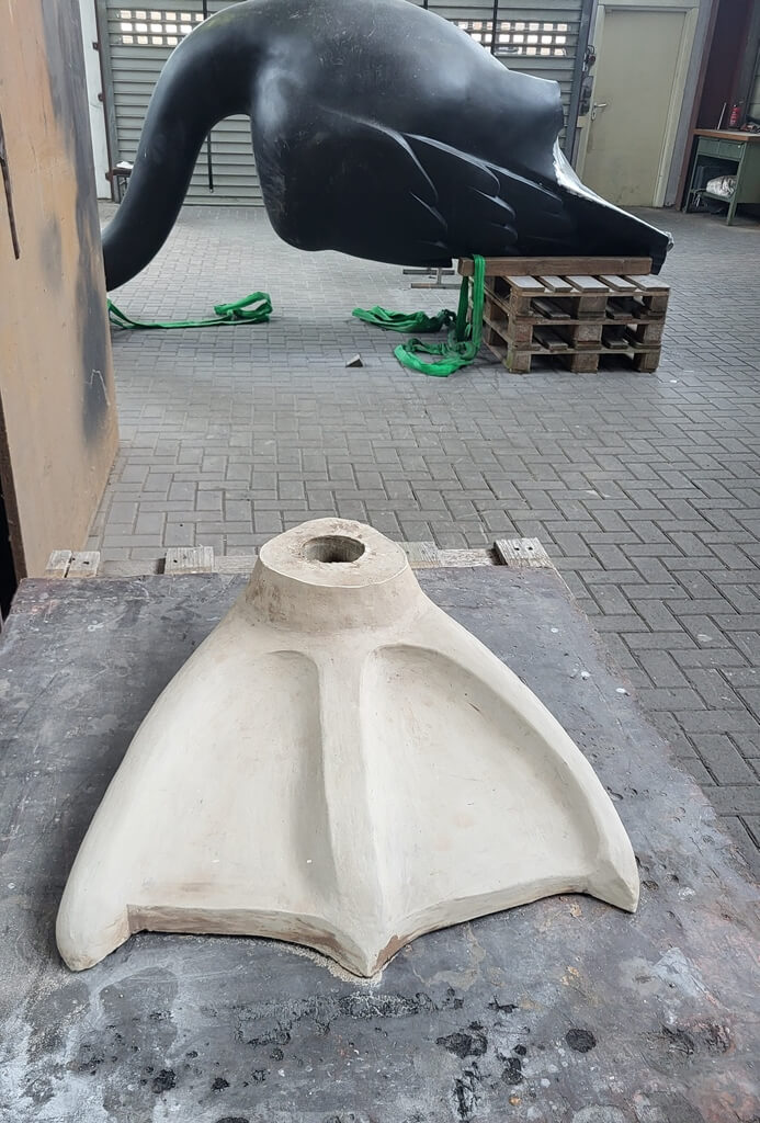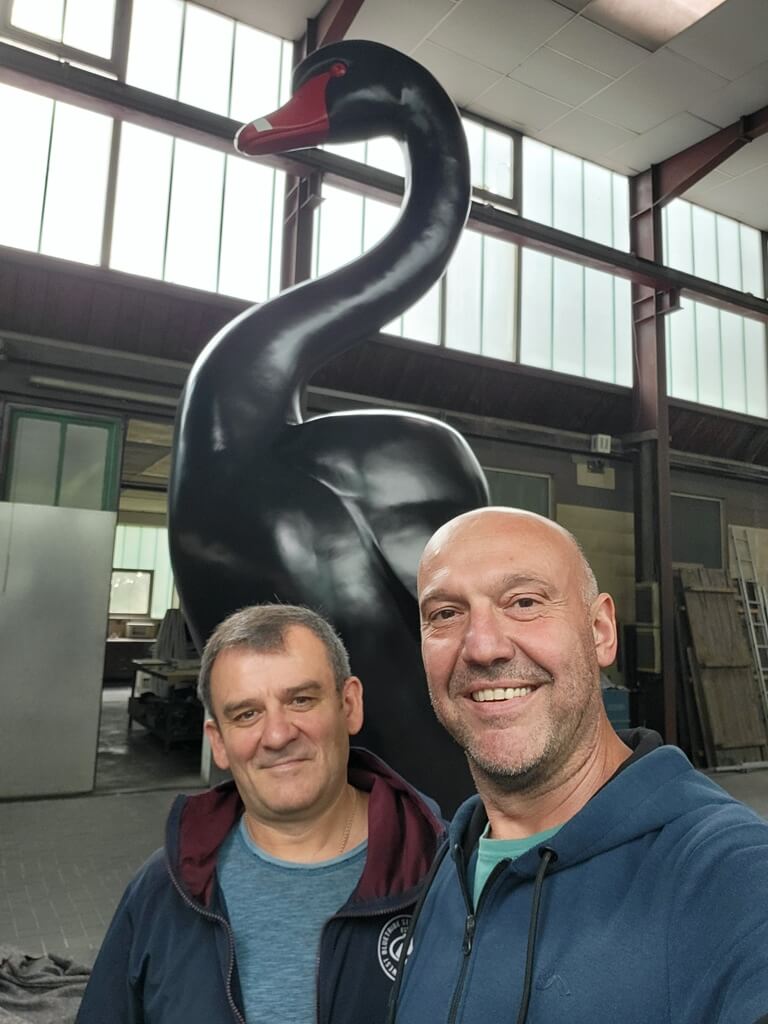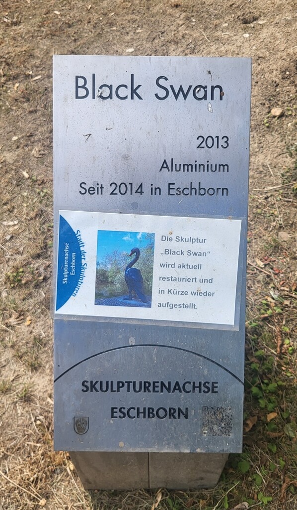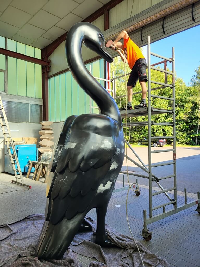 Das Projekt „Black Swan“ aus Eschborn war für uns ein ganz besonders Projekt. Die große Aluminiumskulptur wurde 2013 vom schottischen Künstler Kenny Hunter entworfen und steht seit 2014 in der Skulpturenachse am Weiher in Eschborn. Silvester 2024/2025 wurde die Skulptur an den Beinen und am Korpus von Unbekannten schwer beschädigt.